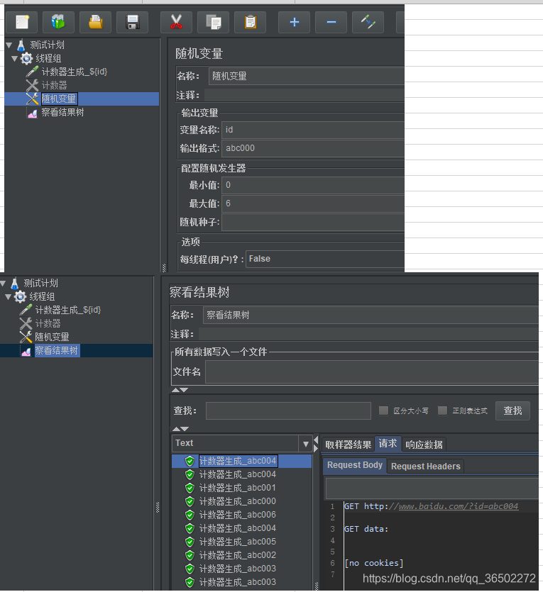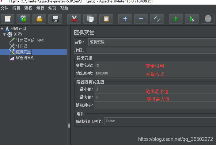 例1: 随机最小值是0,随机最大值是6,变量输出格式abc000,生成变量为abc005 abc004,线程组设置并发或循环10次