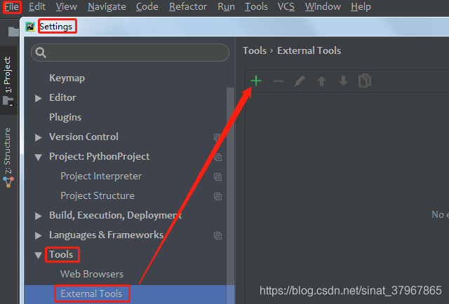 File>>Settings>>Tools>>External tools>>点击左上+号