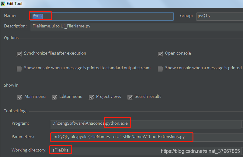 Parameters:-m PyQt5.uic.pyuic $FileName$ -o Ui_$FileNameWithoutExtension$.py