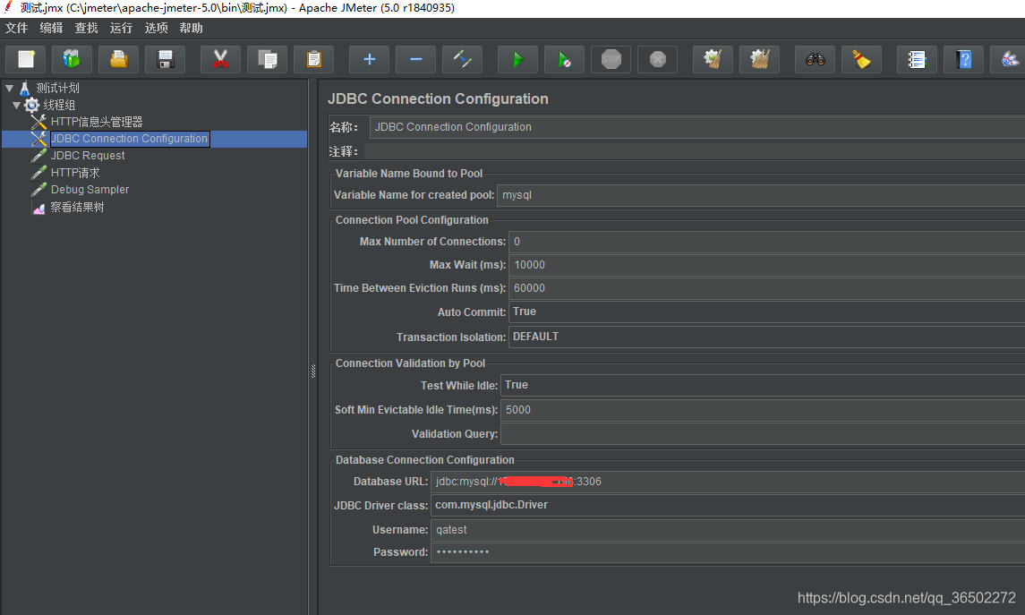 Variable Name:数据库连接池的名称,因为一个测试计划可以有多个JDBC Connection Configuration,每个可以取不同的名称,