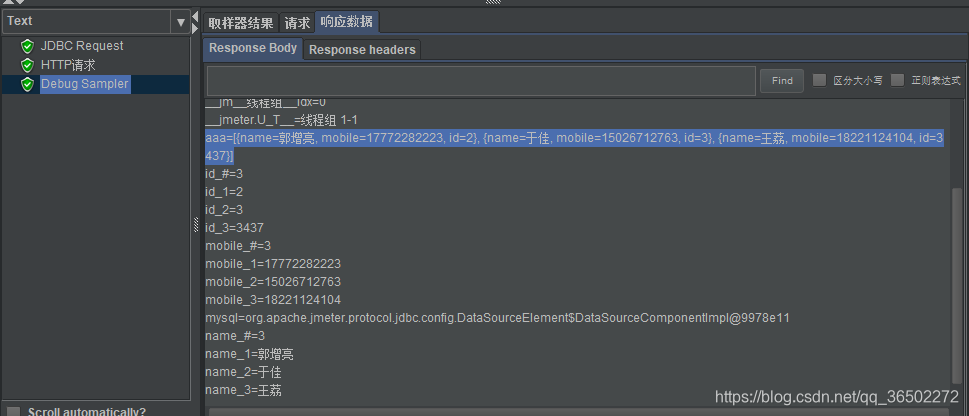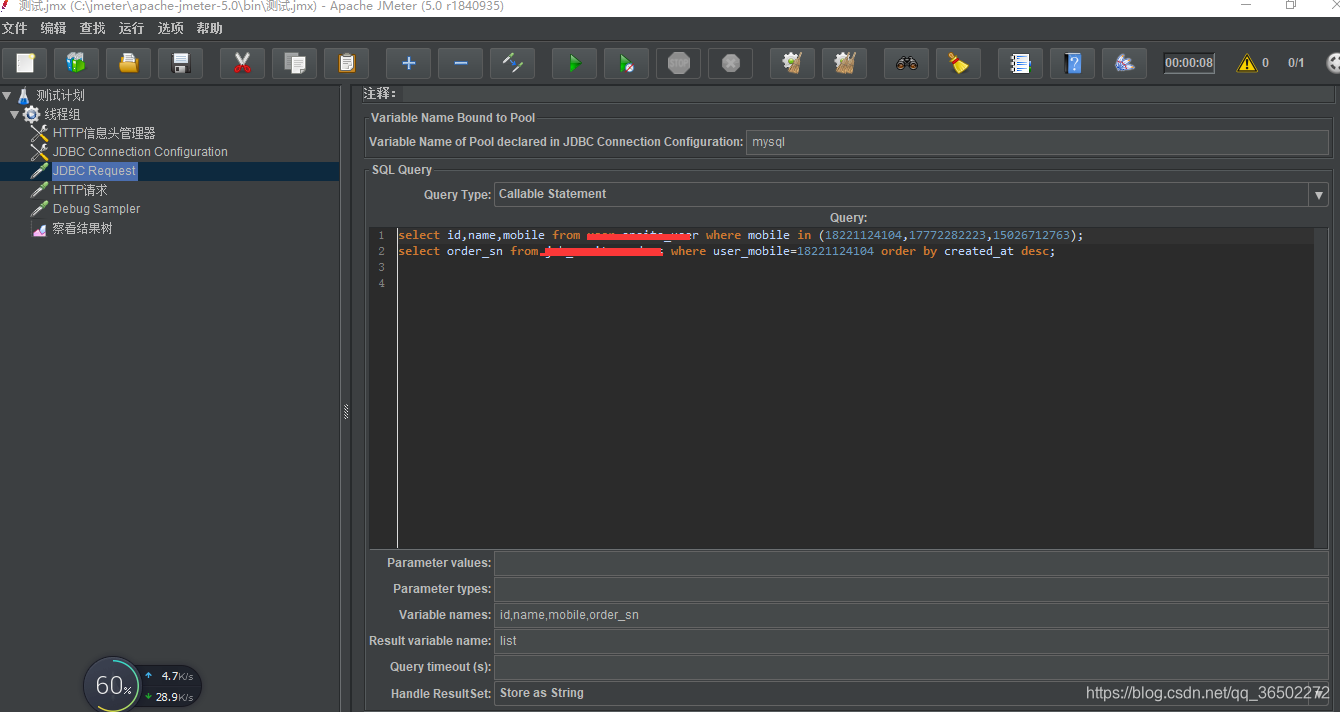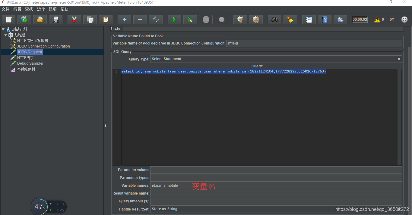 Result variable name:存储结果集,将每行存储成且可以转化成json格式的