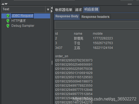 tips:运行结果将会以多个map形式的list保存在所设置的变量中,结果中的列名作为map的key值,列的值作为map的value;使用方法columnValue = vars.getObject("result变量值").get(0结果集第一行的数据从0开始).get("Column Name第一行数据库字段名称一致");