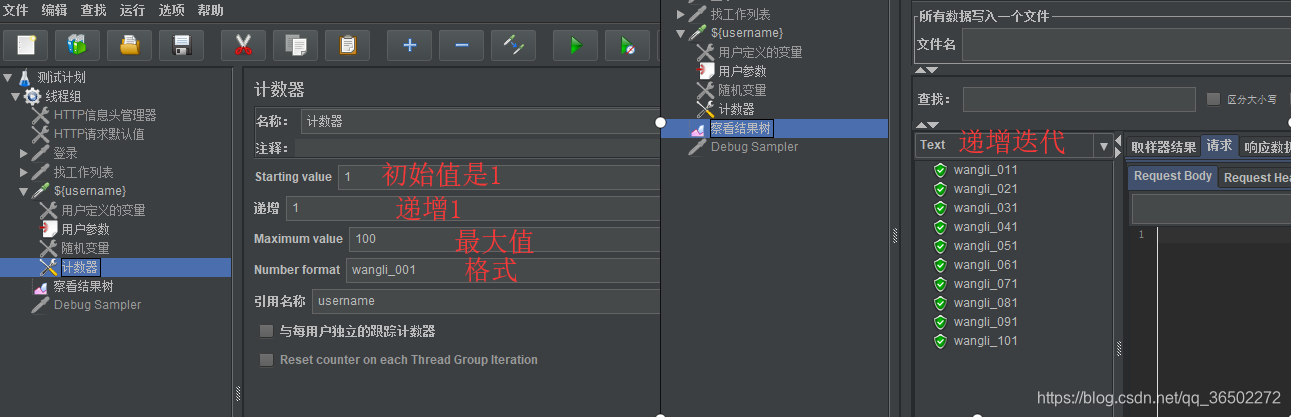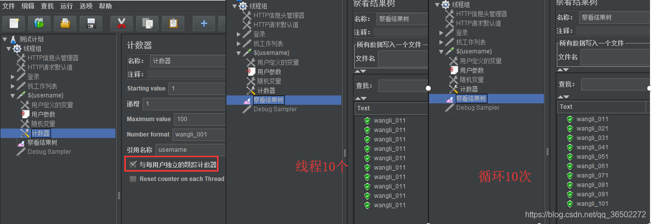 可选,仅勾选与每用户独立的跟踪计数器时可用,如果勾选了,每次线程组迭代,都会重置计数器的值。当线程组是在一个循环控制器内时比较有用
