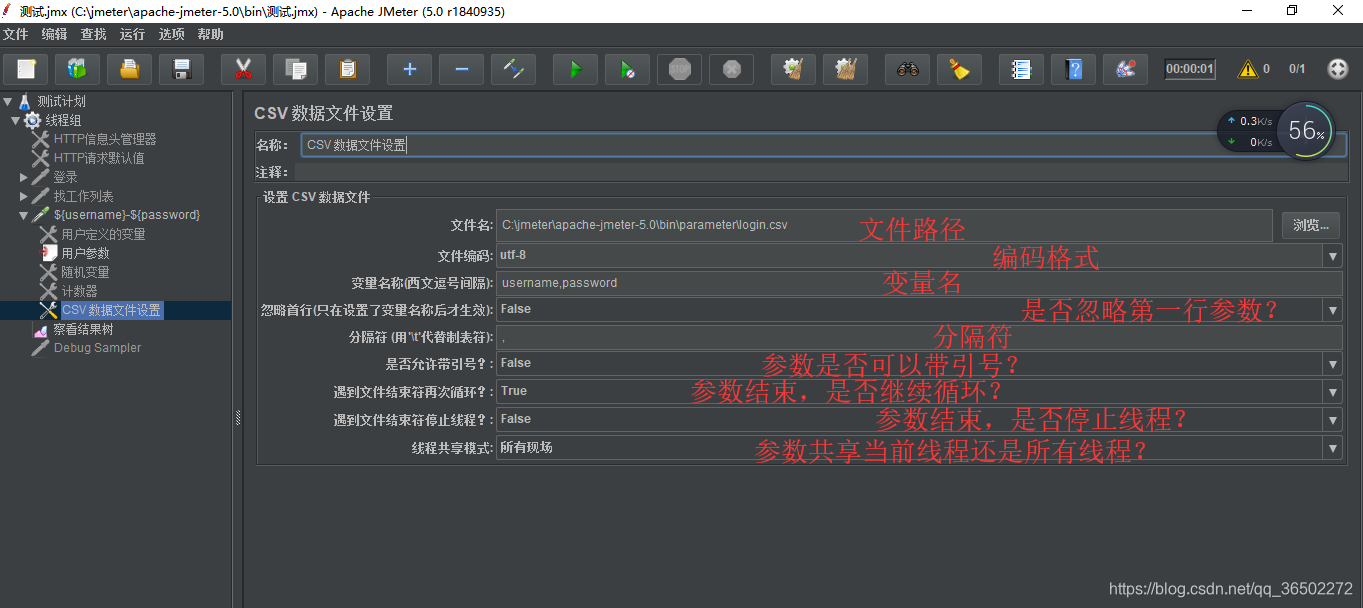 - 当Recycle on EOF 选择true时,Stop thread on EOF选择true和false无任何意义,通俗的讲,在前面控制了不停的循环读取,后面再来让stop或run没有任何意义