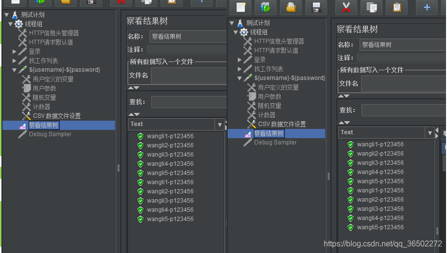 - 如果测试计划中有线程组A、线程组B,A组内有线程A1到线程An,线程组B内有线程B1到线程Bn,CSV Data Set Config放在线程组A的下级组织树,不管怎么设置Sharing mode,都只针对线程组A且取之情况一样:线程A1取第一行,线程A2取第二行。CSV Data Set Config放在测试计划下级组织树(与线程组并列),情况如下 :