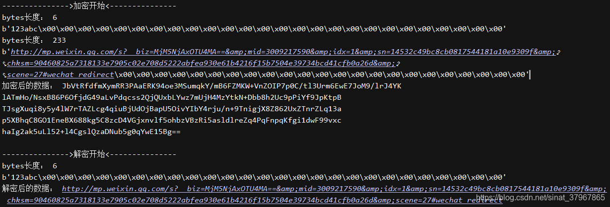 def cut_value(org_str):org_bytes = str.encode(org_str)n = int(len(org_bytes) / 32)print('bytes长度:',len(org_bytes))i = 0new_bytes = b''while n >= 1:i = i + 1new_byte = org_bytes[(i-1)*32:32*i-1]new_bytes += new_byten = n - 1if len(org_bytes) % 32 == 0: # 如果是32的倍数,直接取值all_bytes = org_byteselif len(org_bytes) % 32 != 0 and n>1: # 如果不是32的倍数,每次截取32位相加,最后再加剩下的并补齐32位all_bytes = new_bytes + add_to_32 (org_bytes[i*32:])else:all_bytes = add_to_32 (org_bytes) # 如果不是32的倍数,并且小于32位直接补齐print(all_bytes)return all_bytesdef AES_encrypt(org_str,key):# 初始化加密器aes = AES.new(cut_value(key), AES.MODE_ECB)#先进行aes加密encrypt_aes = aes.encrypt(cut_value(org_str))# 用base64转成字符串形式encrypted_text = str(base64.encodebytes(encrypt_aes), encoding='utf-8') # 执行加密并转码返回bytesprint(encrypted_text)return(encrypted_text)def AES_decrypt(secret_str,key):# 初始化加密器aes = AES.new(cut_value(key), AES.MODE_ECB)# 优先逆向解密base64成bytesbase64_decrypted = base64.decodebytes(secret_str.encode(encoding='utf-8'))# 执行解密密并转码返回strdecrypted_text = str(aes.decrypt(base64_decrypted), encoding='utf-8').replace('\0', '')print(decrypted_text)if __name__ == '__main__':org_str = 'http://mp.weixin.qq.com/s?__biz=MjM5NjAxOTU4MA==&mid=3009217590&idx=1&sn=14532c49bc8cb0817544181a10e9309f&chksm=90460825a7318133e7905c02e708d5222abfea930e61b4216f15b7504e39734bcd41cfb0a26d&scene=27#wechat_redirect'# 秘钥key = '123abc'secret_str = AES_encrypt(org_str,key)AES_decrypt(secret_str,key)