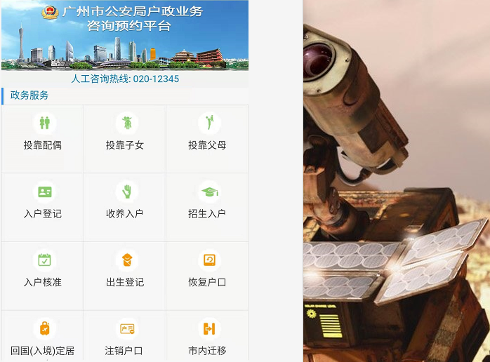 B:公安微信公众号进行预约办理户政业务:关注“广州公安”微信公众号,在下方微信菜单中依次点击:办事大厅—户政业务智能咨询预约,