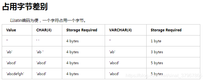 可以用上表来表示,当定义char时,不管你存入多少字符,都会占用到你定义的字符数,而用varchar时,则和你输入的字符数有关,会多一到两个字节来记录字节长度,当数据位占用的字节数小于255时,用1个字节来记录长度,数据位占用字节数大于255时,用2个字节来记录长度,还有一位来记录是否为nul值。