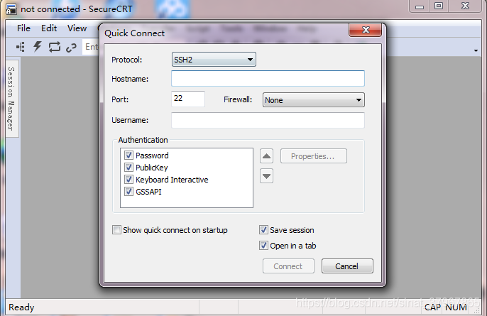 在上面出现的成功窗口中,输入Hostname(服务器IP),Username(服务器登录用户名),其他内容默认。此外如果需要新增连接,通过菜单File-->Quick Connect也可以进到同样窗口