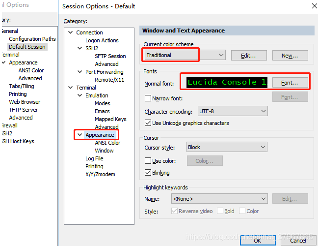 选择Appearance,背景Current color scheme选择自己喜欢的,字体Normal font自己喜欢的,最后点击ok就到了前面截图看到的服务器信息页面了。