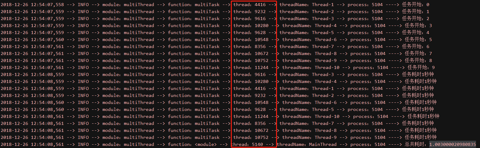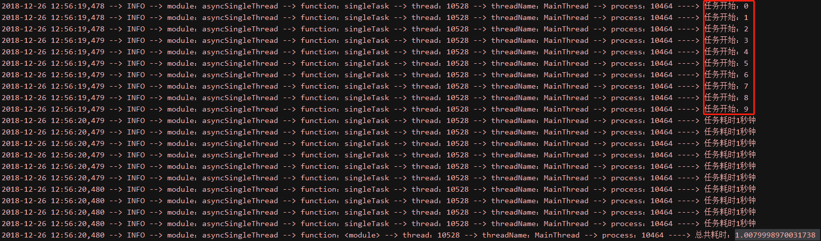 logger = Logger("multiThread").get_log()def multiTask(t):logger.info("任务开始:%s", t)time.sleep(1)logger.info('任务耗时1秒钟')def main():threads = [threading.Thread(target = multiTask,args=(t,)) for t in range(0,10)]for t in threads:t.start()for t in threads:t.join()if __name__ == '__main__':t1 = time.time()main()logger.info("总共耗时:%s ",time.time()-t1)
