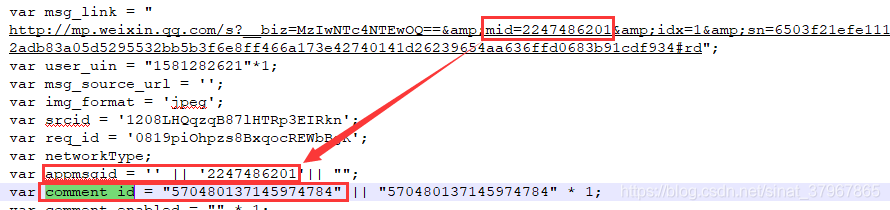 文章评论API中的appmsgid是具体文章的图文消息ID,comment_id也与具体文章相关,appmsg_token每篇文章也不同。通过文章链接获取源代码我们可以查看到文章评论API的三个参数comment_id,appmsgid,appmsg_token,如下图: