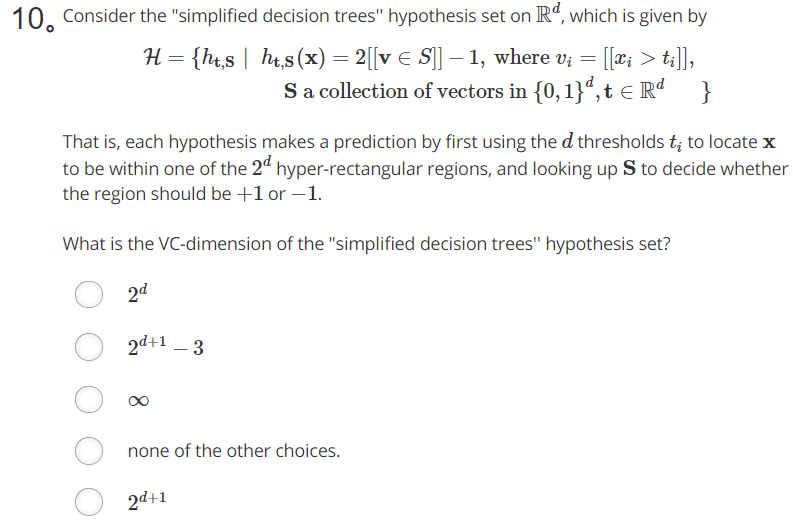 题目如上图所示,答案是:;在网上看到的答案中有一个很好的解释就是说在一个n纬的欧几里德空间里,分别按照参数做一个垂直于每个轴的超平面,这些超平面能够打散