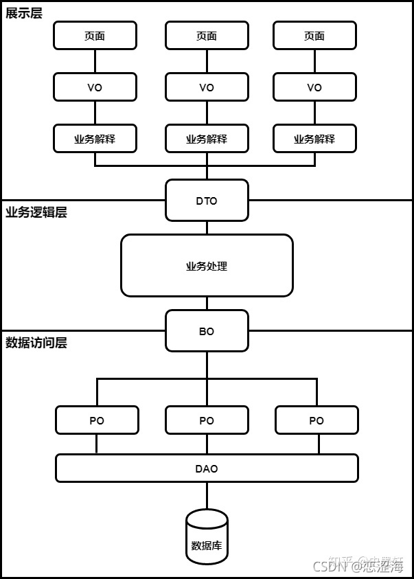 为什么BO也画成横跨两层呢?原因是现在很多持久层框架自身就提供了数据组合的功能,因此BO有可能是在业务层由业务来拼装PO而成,也有可能是在数据库访问层由框架直接生成