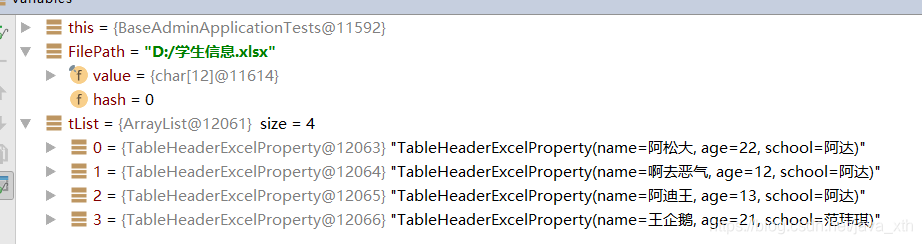 public class BaseAdminApplicationTests {@Testpublic void easyExcelTest() {String FilePath="D:/学生信息.xlsx";List<T> tList = EasyExcelUtil.syncReadModel(FilePath, TableHeaderExcelProperty.class);System.out.println(tList);}