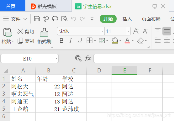 public class TableHeaderExcelProperty extends BaseRowModel {/*** value: 表头名称* index: 列的号, 0表示第一列*/@ExcelProperty(value = "姓名", index = 0)private String name;@ExcelProperty(value = "年龄",index = 1)private int age;@ExcelProperty(value = "学校",index = 2)private String school;