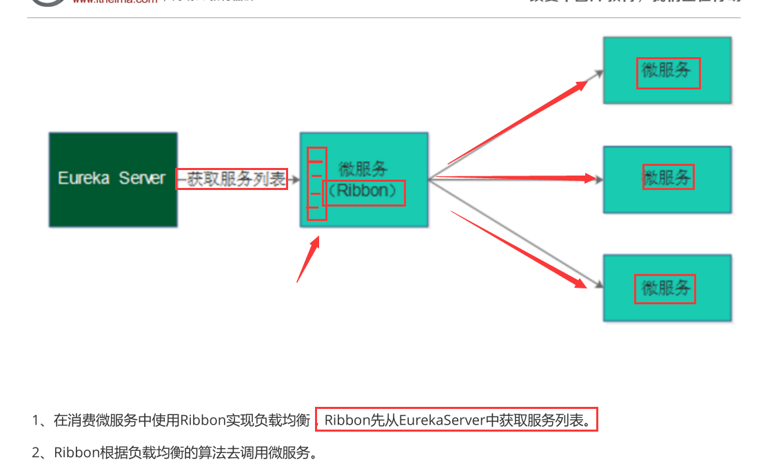 Eureka Server获取服务列表,Ribbon根据负载均衡算法直接请求到具体的微服务,中间省去了负载均衡服务器。
