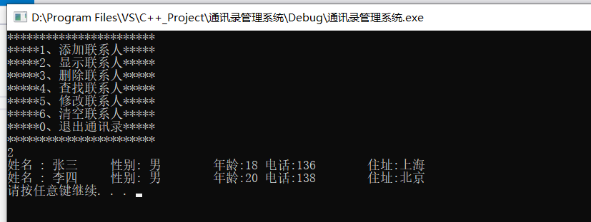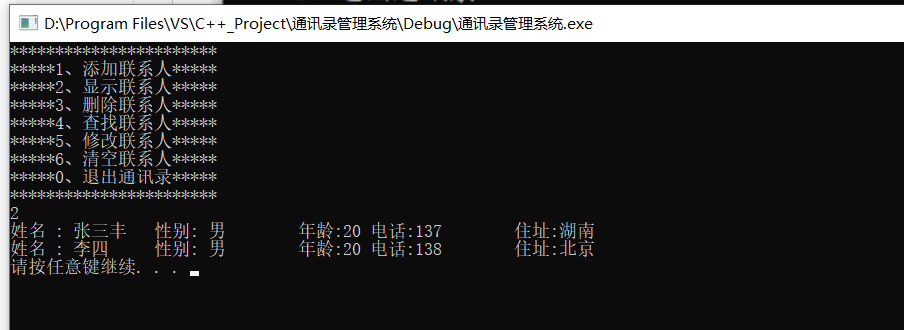 int main() {//创建通讯录结构体变量Addressbooks abs;//初始化通讯录中当前人员个数abs.m_Size = 0;int select = 0;//创建用户选择输入菜单的变量while (true){showMenu();cin >> select;switch (select){case 1:            //1、添加联系人addPerson(&abs);  //利用地址传递可以修饰形参break;case 2:            //2、显示联系人showPerson(&abs);break;case 3:            //3、删除联系人/**{cout << "请输入删除联系人姓名 : " << endl;string name;cin >> name;if (isExist(&abs, name) == -1){cout << " 查无此人" << endl;}else{		cout << "找到此人" << endl;}}*/deletePerson(&abs);break;case 4:            //4、查找联系人findPerson(&abs);break;case 5:            //5、修改联系人modifyPerson(&abs);break;case 6:            //6、清空联系人break;case 0:            //0、退出通讯录cout << "欢迎下次使用" << endl;system("pause");return 0;break;default:break;}}system("pause");}添加了2个联系人