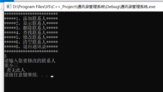 实现思路:查找用户输入的联系人,如果查找成功进行修改操作,查找失败提示查无此人