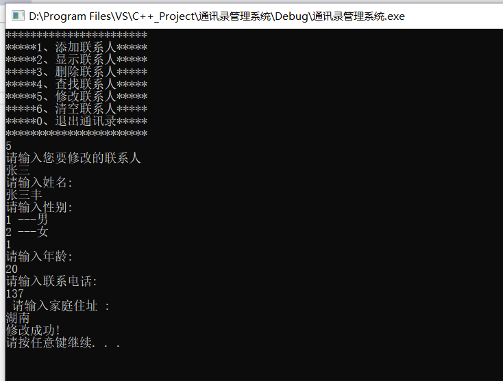 {cout << "请输入您要修改的联系人" << endl;string name;cin >> name;int ret = isExist(abs,name);if (ret != -1) {   //找到联系人//姓名string name;cout << "请输入姓名:" << endl;cin >> name;abs -> personArray[ret].m_Name = name;//性别cout << "请输入性别:" << endl;cout <<  "男" << endl;cout << "2 ---女" << endl;int sex = 0;while (true){cin >> sex;if (sex == 1 || sex == 2){//输入正确退出循环输入abs->personArray[ret].m_Sex = sex;break;}cout << "输入有误,请重新输入" <<  endl;}//年龄cout << "请输入年龄:" << endl;int age = 0;cin >> age;abs->personArray[ret].m_Age = age;//电话cout << "请输入联系电话:" << endl;string phone;cin >> phone;abs->personArray[ret].m_Phone = phone;//住址cout << " 请输入家庭住址 : " << endl;string address;cin >> address;abs->personArray[ret].m_Addr = address;cout << "修改成功! " << endl;}else {     //未找到联系人cout << " 查无此人" << endl;}system("pause");system("cls");