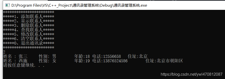 int main() {//创建通讯录结构体变量Addressbooks abs;//初始化通讯录中当前人员个数abs.m_Size = 0;int select = 0;//创建用户选择输入菜单的变量while (true){showMenu();cin >> select;switch (select){case 1: //1、添加联系人addPerson(&abs); //利用地址传递可以修饰形参break;case 2: //2、显示联系人showPerson(&abs);break;case 3: //3、删除联系人/**{cout << "请输入删除联系人姓名 : " << endl;string name;cin >> name;if (isExist(&abs, name) == -1){cout << " 查无此人" << endl;}else{ cout << "找到此人" << endl;}}*/deletePerson(&abs);break;case 4: //4、查找联系人findPerson(&abs);break;case 5: //5、修改联系人break;case 6: //6、清空联系人break;case 0: //0、退出通讯录cout << "欢迎下次使用" << endl;system("pause");return 0;break;default:break;}}system("pause");}