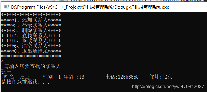 void findPerson(Addressbooks * abs){cout << " 请输入您要查找的联系人" << endl;string name;cin >> name;//判断指定的联系人是否存在通讯录中int ret = isExist(abs, name);if (ret != -1) {//找到联系人cout << " 姓名 :" << abs->personArray[ret].m_Name << "\t";cout << "性别 :" << abs->personArray[ret].m_Sex << "\t" ;cout << "年龄 :" << abs->personArray[ret].m_Age << "\t" ;cout << "电话:" << abs->personArray[ret].m_Phone << "\t" ;cout << " 住址:" << abs->personArray[ret].m_Addr << endl;}else { //未找到联系人cout << " 查无此人" << endl;}system("pause");system("cls");}