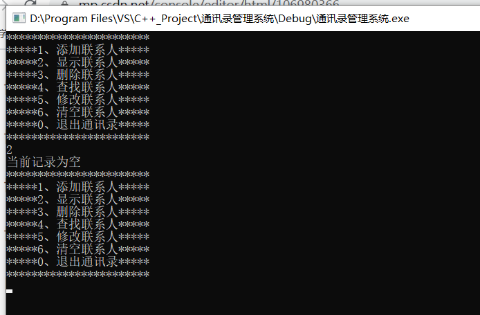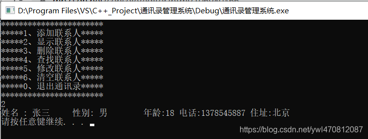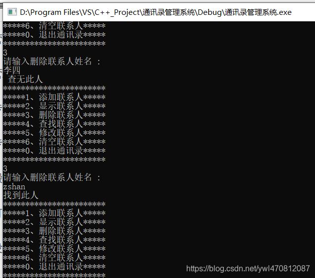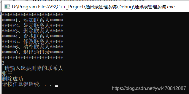 void deletePerson(Addressbooks * abs){cout << " 请输入您要删除的联系人" << endl;string name;cin >> name;//ret == -1未查到 .//ret != -1查到 了int ret = isExist(abs,name);if (ret != -1) {// 查找到人,要进行删除操作for (int i = ret; i < abs->m_Size; i++) {//数据前移abs->personArray[i] = abs->personArray[i + 1];}abs->m_Size--; //更新通讯录中的人员数cout << "删除成功" <<endl;}else {cout << "未找到此人" << endl;}system("pause");system("cls");}int main() {//创建通讯录结构体变量Addressbooks abs;//初始化通讯录中当前人员个数abs.m_Size = 0;int select = 0;//创建用户选择输入菜单的变量while (true){showMenu();cin >> select;switch (select){case 1:            //1、添加联系人addPerson(&abs);  //利用地址传递可以修饰形参break;case 2:            //2、显示联系人showPerson(&abs);break;case 3:            //3、删除联系人/**{cout << "请输入删除联系人姓名 : " << endl;string name;cin >> name;if (isExist(&abs, name) == -1){cout << " 查无此人" << endl;}else{		cout << "找到此人" << endl;}}*/deletePerson(&abs);break;case 4:            //4、查找联系人break;case 5:            //5、修改联系人break;case 6:            //6、清空联系人break;case 0:            //0、退出通讯录cout << "欢迎下次使用" << endl;system("pause");return 0;break;default:break;}}system("pause");}现在添加了一名联系人