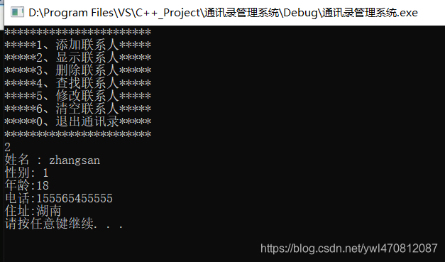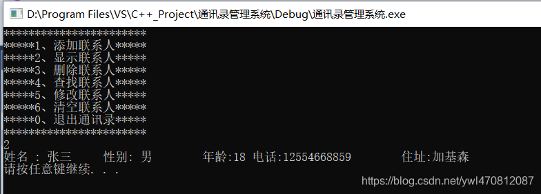 void showPerson(Addressbooks * abs) {//判断通讯录的联系人是否为空  如果0提示为空,不为0,显示联系人信息if (abs->m_Size == 0){cout << "当前记录为空" << endl;}else {for (int i = 0; i < abs->m_Size; i++) {cout << "姓名 : " << abs->personArray[i].m_Name << endl;cout << "性别: " << abs->personArray[i].m_Sex << endl;cout << "年龄:"	<< abs->personArray[i].m_Age << endl;cout << "电话:"  << abs->personArray[i].m_Phone << endl;cout << "住址:" << abs->personArray[i].m_Addr << endl;}system("pause");//请按任意键继续system("cls");//清屏}}int main() {//创建通讯录结构体变量Addressbooks abs;//初始化通讯录中当前人员个数abs.m_Size = 0;int select = 0;//创建用户选择输入菜单的变量while (true){showMenu();cin >> select;switch (select){case 1:            //1、添加联系人addPerson(&abs);  //利用地址传递可以修饰形参break;case 2:            //2、显示联系人showPerson(&abs);break;case 3:            //3、删除联系人break;case 4:            //4、查找联系人break;case 5:            //5、修改联系人break;case 6:            //6、清空联系人break;case 0:            //0、退出通讯录cout << "欢迎下次使用" << endl;system("pause");return 0;break;default:break;}}system("pause");}1.2、测试显示联系人功能