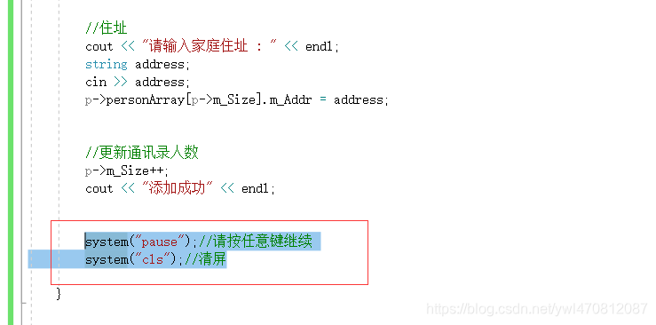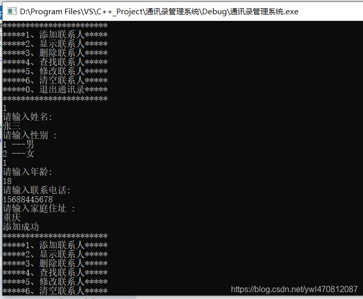 void addPerson(Addressbooks * p) {//先判断通讯录是不是已经满了,满了不在添加if (p->m_Size == MAX) {cout << "通讯录已经满了" << endl;return;}else {//具体添加联系人//姓名string name;cout << "请输入姓名: " << endl;cin >> name;p->personArray[p->m_Size].m_Name = name;//性别cout << "请输入性别 :" << endl;cout << "1 ---男" << endl;cout << "2 ---女" << endl;int sex = 0;while (true){//如果输入的是1或者2可以退出循环,因为输入的是正确值// 如果输入有误,重新输入[cin >> sex;if (sex == 1 || sex == 2) {p->personArray[p->m_Size].m_Sex = sex;break;}cout << "输入有误请重新输入" << endl;}//年龄cout << "请输入年龄:" << endl;int age = 0;cin >> age;p->personArray[p->m_Size].m_Age = age;//电话cout << "请输入联系电话:"<< endl;string phone;cin >> phone;p->personArray[p->m_Size].m_Phone = phone;//住址cout << "请输入家庭住址 : " << endl;string address;cin >> address;p->personArray[p->m_Size].m_Addr = address;//更新通讯录人数p->m_Size++;cout << "添加成功" << endl;}}