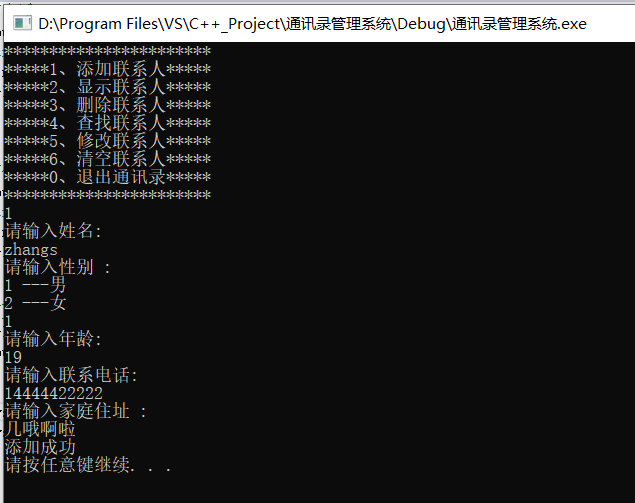 void addPerson(Addressbooks * p) {//先判断通讯录是不是已经满了,满了不在添加if (p->m_Size == MAX) {cout << "通讯录已经满了" << endl;return;}else {//具体添加联系人//姓名string name;cout << "请输入姓名: " << endl;cin >> name;p->personArray[p->m_Size].m_Name = name;//性别cout << "请输入性别 :" << endl;cout << "1 ---男" << endl;cout << "2 ---女" << endl;int sex = 0;while (true){//如果输入的是1或者2可以退出循环,因为输入的是正确值// 如果输入有误,重新输入[cin >> sex;if (sex == 1 || sex == 2) {p->personArray[p->m_Size].m_Sex = sex;break;}cout << "输入有误请重新输入" << endl;}//年龄cout << "请输入年龄:" << endl;int age = 0;cin >> age;p->personArray[p->m_Size].m_Age = age;//电话cout << "请输入联系电话:"<< endl;string phone;cin >> phone;p->personArray[p->m_Size].m_Phone = phone;//住址cout << "请输入家庭住址 : " << endl;string address;cin >> address;p->personArray[p->m_Size].m_Addr = address;//更新通讯录人数p->m_Size++;cout << "添加成功" << endl;}}1.5、测试添加联系人功能