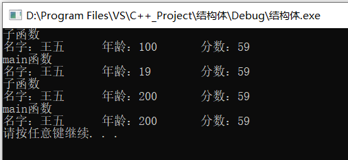 // cout << "名字" << st2.name << "年龄" << st2.age << "分数" << st2.score<< endl;st3.name = "王五";st3.age = 19;st3.score = 59;printStufdent1(st3);cout << "main函数" << endl;cout << "名字:" << st3.name << " 年龄:" << st3.age << " 分数:" << st3.score << endl;printStufdent2(&st3);cout << "main函数" << endl;cout << "名字:" << st3.name << " 年龄:" << st3.age << " 分数:" << st3.score << endl;system("pause");}