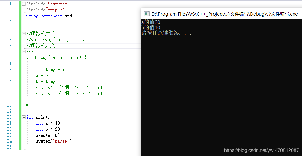 }int main() {int a = 10;int b = 20;swap(a, b);system("pause");