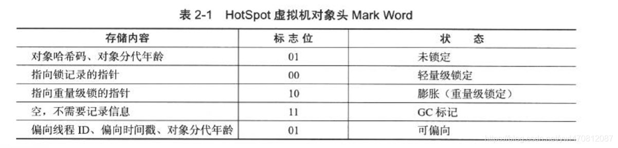 在HotSpot虚拟机中,对象在内存中存储的布局可以分为3块区域:对象头( Header)、实例数据(Instance Data)和对齐填充( Padding).HotSpot虛拟机的对象头包括两部分信息,第一部分用于存储对象自身的运行时数据,如哈希码(HashCode)、 GC分代年龄、锁状态标志、线程持有的锁、偏向线程ID、偏向时间戳等,这部分数据的长度在32位和64位的虚拟机(未开启压缩指针)中分别为32bit和64bit,官方称它为“Mark Word"。对象需要存储的运行时数据很多,其实已经超出了32位、64位Bitmap结构所能记录的限度,但是对象头信息是与对象自身定义的数据无关的额外存储成本,考虑到虛拟机的空间效率,MarkWord被设计成一个非固定的数据结构以便在极小的空间内存储尽量多的信息,它会根据对象的状态复用自己的存储空间。例如:在32位的HotSpot虚拟机中,如果对象处于未被锁定的状态下,那么Mark Word的32bit空间中的25bit用于存储对象哈希码,4bit 用于存储对象分代年龄,2bit 用于存储锁标志位,1bit 固定为0,而在其他状态(轻量级锁定、重量级锁定、GC标记、可偏向)下对象的存储内容见表2-1