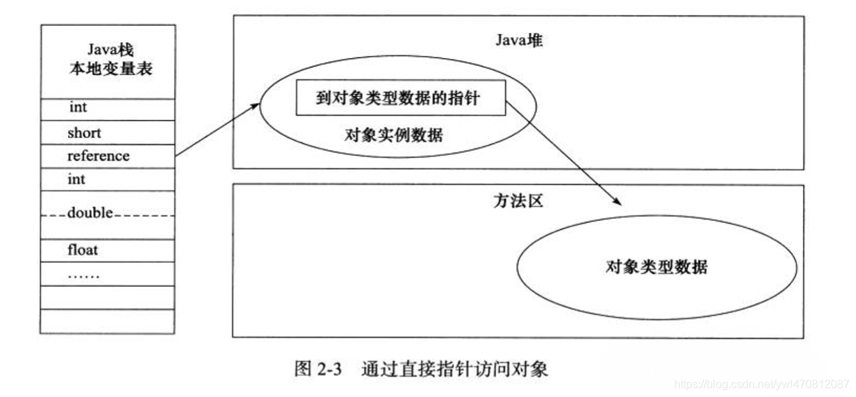 如果使用直接指针访问,那么Java堆对象的布局中就必须考虑如何放置访问类型数据的相关信息,而reference中存储的直接就是对象地址,如图2-3所示。