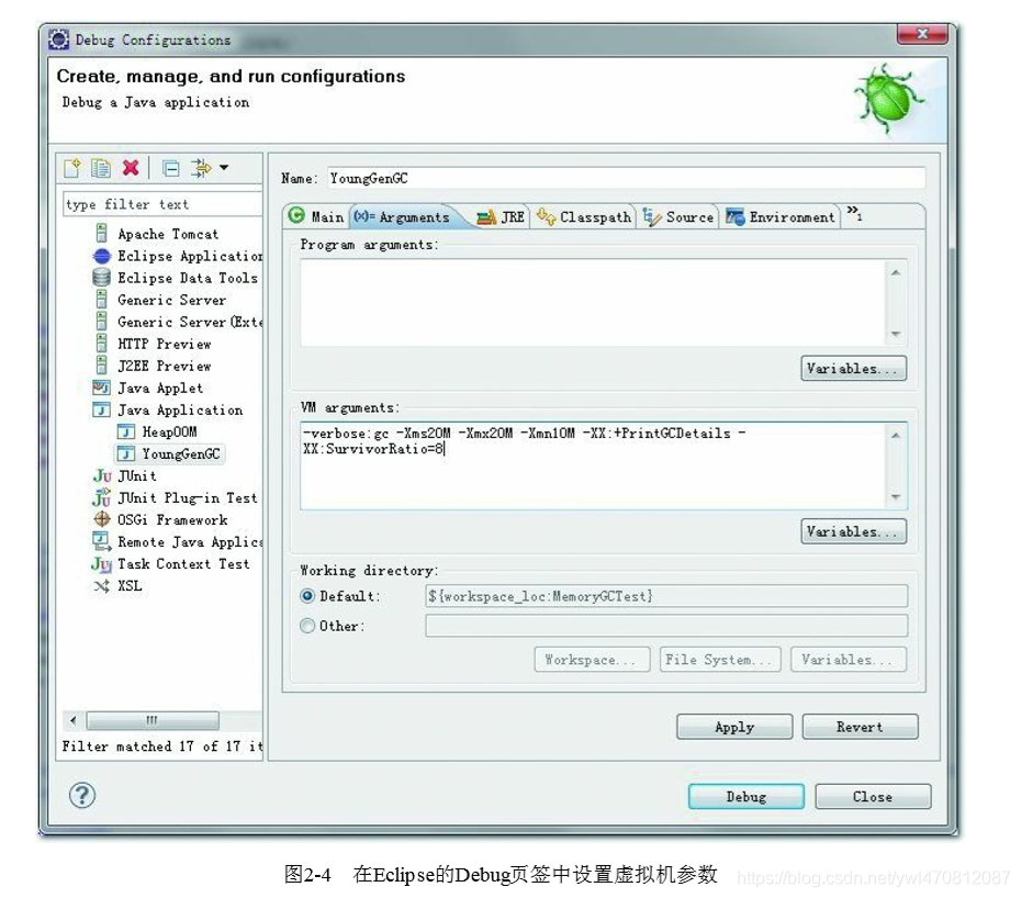 存储的内容;第二,希望读者在工作中遇到实际的内存溢出异常时,能根据异常的信息快速判断是哪个区域的内存溢出,知道伟么样的代码可能会导致这些区域内存溢出,以及出现这些异常后该如何处理。下文代码的开头都注释了执行时所需要设置的虚拟机启动参数(注释中“VM Args"后面跟着的参数),这些参数对实验的结果有直接影响,读者调试代码的时候千万不要忽略。如果读者使用控制台命令来执行程序,那直接跟在Java命令之后书写就可以。如果读者使用Eclipse IDE,则可以参考图2-4在Debug/Run页签中的设置。