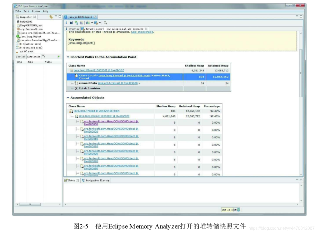 要解决这个内存区域的异常,常规的处理方法是首先通过内存映像分析工具(如Eclipse Memory Analyzer)对Dump出来的堆转储快照进行分析。第一步首先应确认内存中导致OOM的对象是否是必 要的,也就是要先分清楚到底是出现了内存泄漏(Memory Leak)还是内存溢出(Memory Overflow)。图2-5显示了使用Eclipse Memory Analyzer打开的堆转储快照文件。