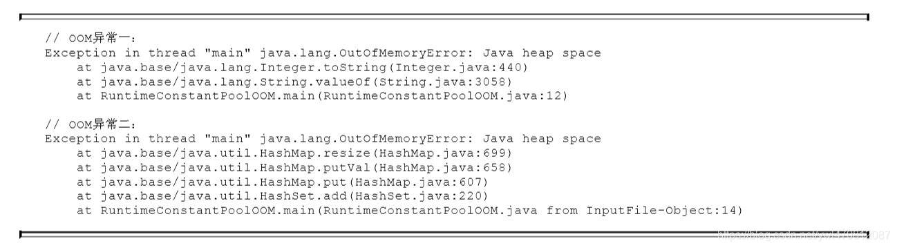 而使用JDK 7或更高版本的JDK来运行这段程序并不会得到相同的结果,无论是在JDK 7中继续使 用-XX:MaxPermSize参数或者在JDK 8及以上版本使用-XX:MaxMeta-spaceSize参数把方法区容量同 样限制在6MB,也都不会重现JDK 6中的溢出异常,循环将一直进行下去,永不停歇[1]。出现这种变 化,是因为自JDK 7起,原本存放在永久代的字符串常量池被移至Java堆之中,所以在JDK 7及以上版 本,限制方法区的容量对该测试用例来说是毫无意义的。这时候使用-Xmx参数限制最大堆到6MB就能 够看到以下两种运行结果之一,具体取决于哪里的对象分配时产生了溢出: