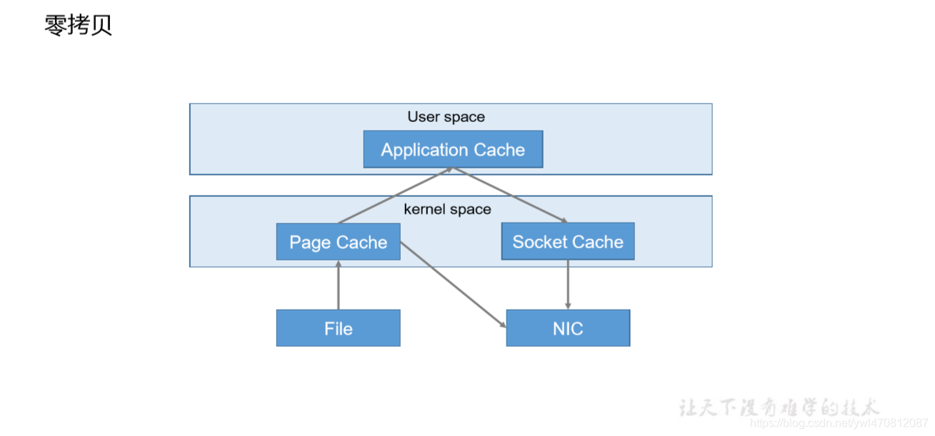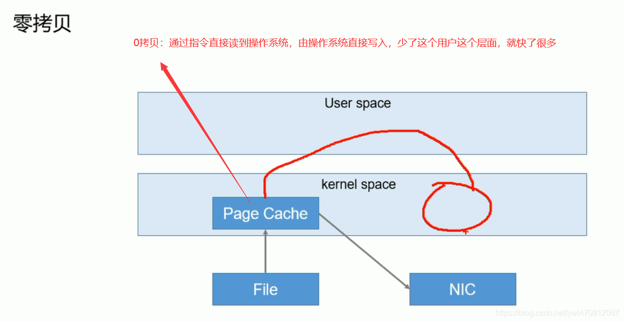假如你本地磁盘某个目录下有一个1.txt文件,要写到2.txt这个文件下,我们学过网络编程我们都知道,我们需要使用 IO流读取1.txt,然后写入2.txt。但是我们的代码是无法直接操作文件的,代码会调用操作系统将文件读到操作系统的kernel space的这块空间,然后读到用户空间,也就是你的代码,通过你的代码又写到操作系统的kernel space这块空间,有操作系统来完成文件的写入 ,我们都知道底层对文件的操作都是c语言来完成的,这种操作是不是比较慢的。