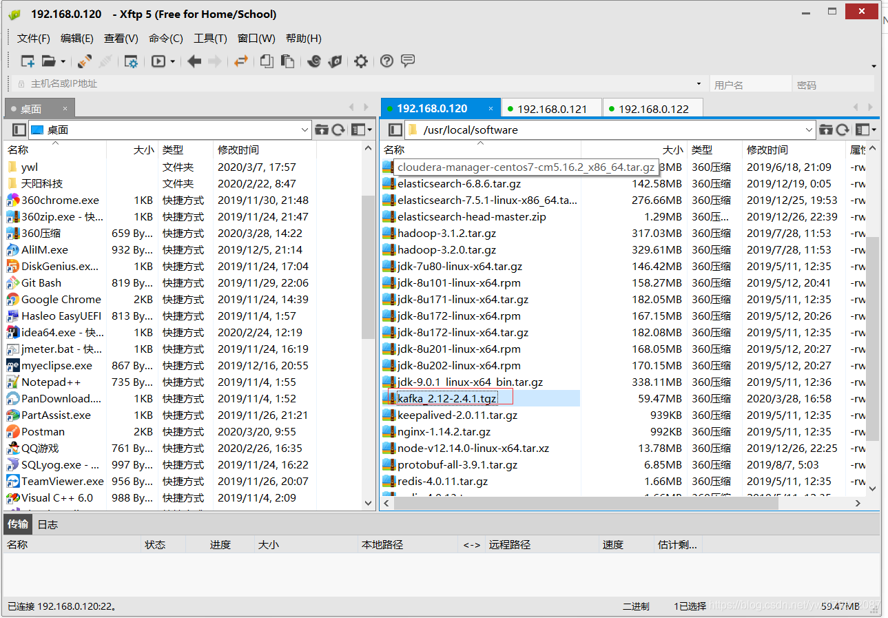 这里我选择了最新版本下载,然后上传到centos7下,这里我使用xftp5这个工具上传到usr/local/software目录下(这里我上台机器都上传了,为了后面搭建集群使用)
