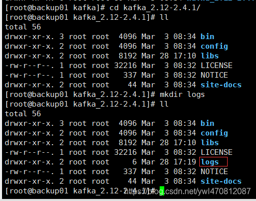3)在/usr/local/hadoop/kafka/kafka_2.12-2.4.1/ 目录下创建 logs 文件夹