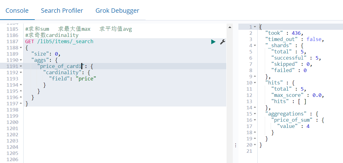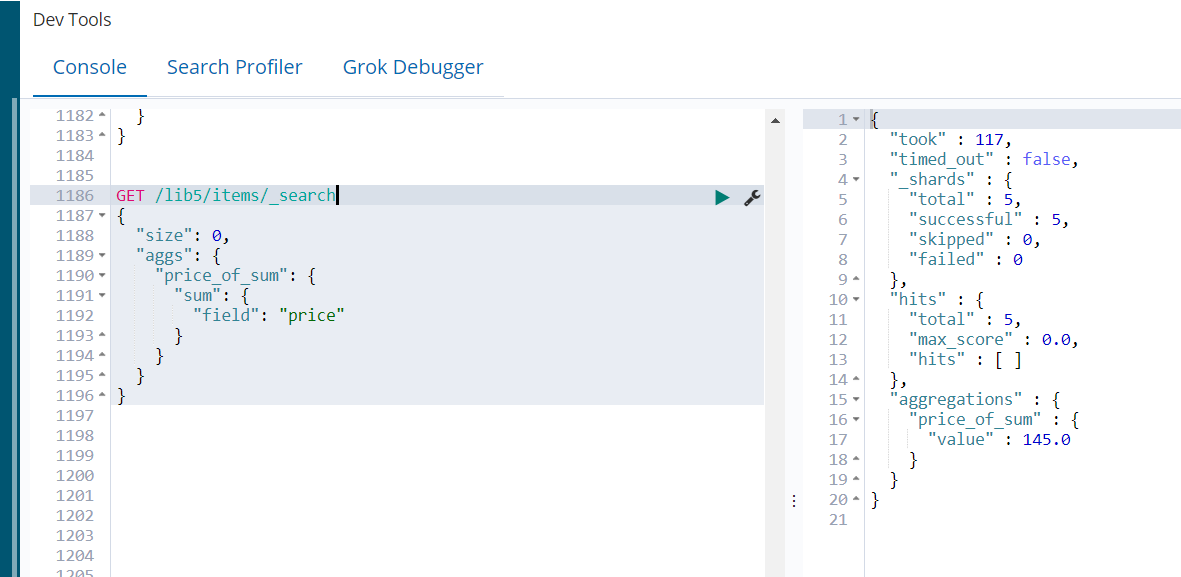 {"took" : 414,"timed_out" : false,"_shards" : {"total" : 5,"successful" : 5,"skipped" : 0,"failed" : 0},"hits" : {"total" : 5,"max_score" : 1.0,"hits" : [{"_index" : "lib5","_type" : "items","_id" : "5","_score" : 1.0,"_source" : {"price" : null,"itemID" : "ID100127"}},{"_index" : "lib5","_type" : "items","_id" : "2","_score" : 1.0,"_source" : {"price" : 50,"itemID" : "ID100124"}},{"_index" : "lib5","_type" : "items","_id" : "4","_score" : 1.0,"_source" : {"price" : 30,"itemID" : "ID100125"}},{"_index" : "lib5","_type" : "items","_id" : "1","_score" : 1.0,"_source" : {"price" : 40,"itemID" : "ID100123"}},{"_index" : "lib5","_type" : "items","_id" : "3","_score" : 1.0,"_source" : {"price" : 25,"itemID" : "ID100124"}}]},"aggregations" : {"price_of_sum" : {"value" : 145.0}}