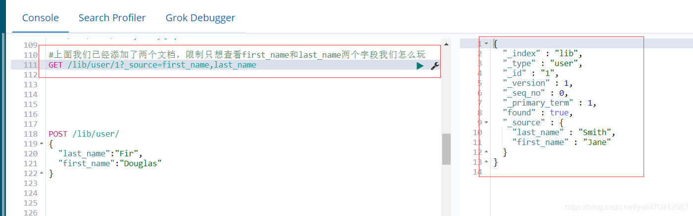GET /lib/user/1{"_index" : "lib","_type" : "user","_id" : "1","_version" : 4,"_seq_no" : 5,"_primary_term" : 1,"found" : true,"_source" : {"first_name" : "Jane","last_name" : "Smith","age" : 48,"about" : "I like to collect rock albums","interests" : ["music"]}