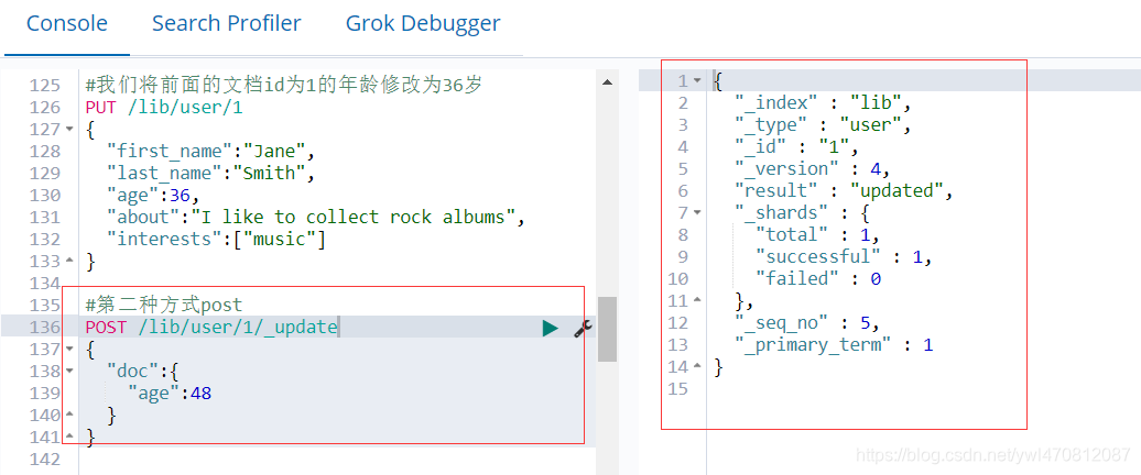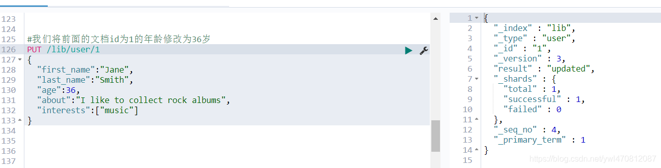 {"_index" : "lib","_type" : "user","_id" : "1","_version" : 2,"result" : "updated","_shards" : {"total" : 1,"successful" : 1,"failed" : 0},"_seq_no" : 3,"_primary_term" : 1