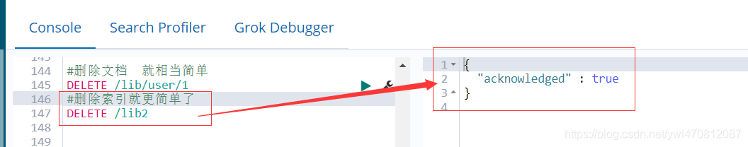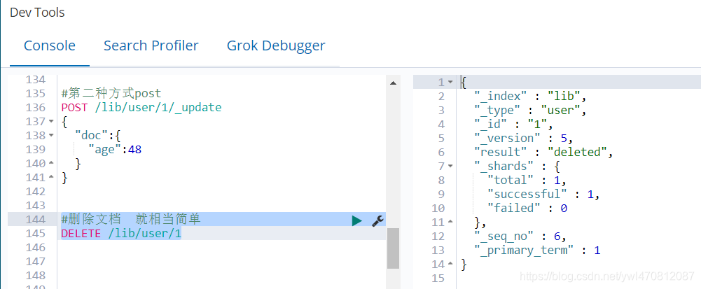 {"_index" : "lib","_type" : "user","_id" : "1","_version" : 5,"result" : "deleted","_shards" : {"total" : 1,"successful" : 1,"failed" : 0},"_seq_no" : 6,"_primary_term" : 1