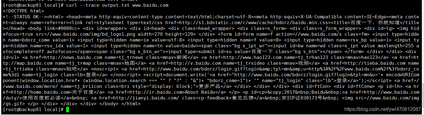 curl --trace output.txt www.baidu.com (把信息输入到文本中)