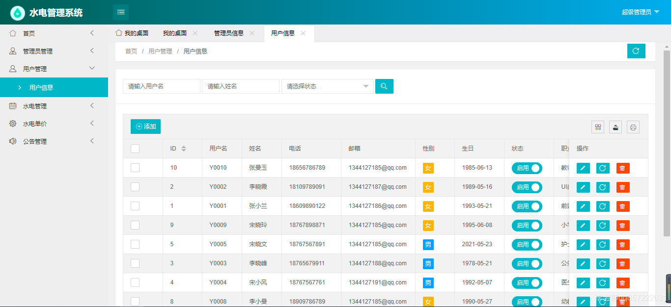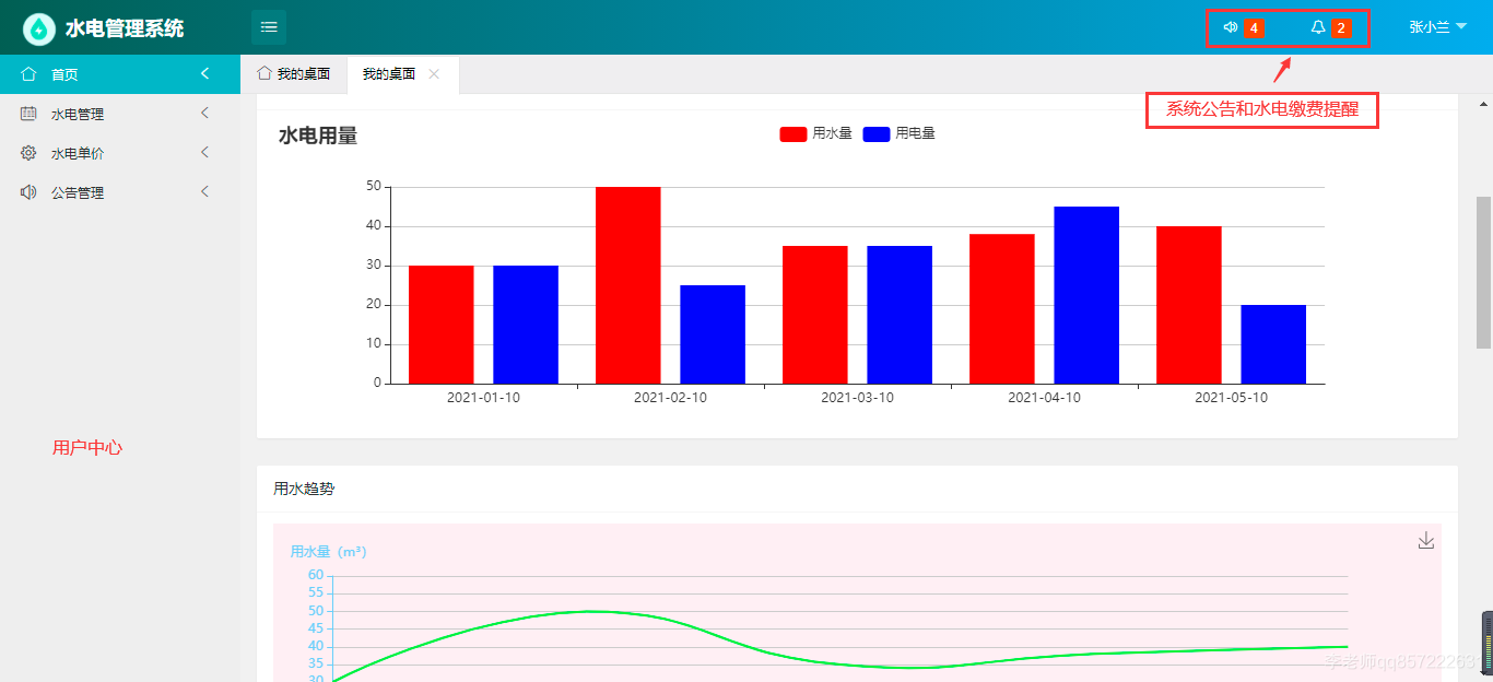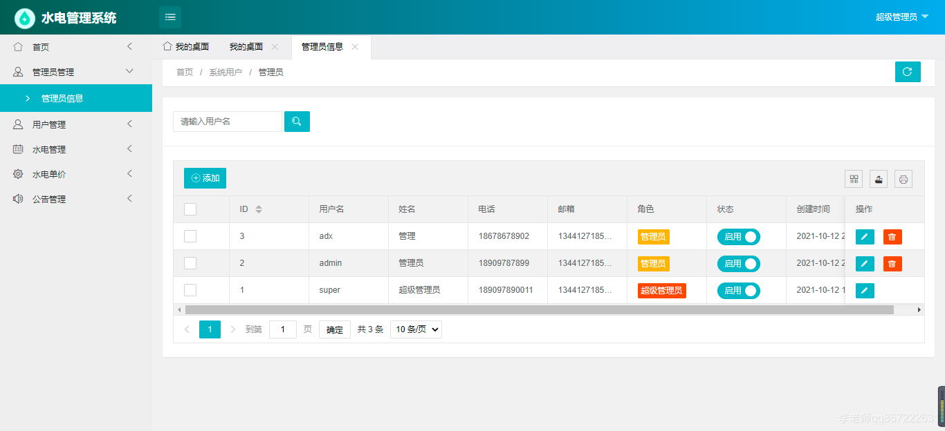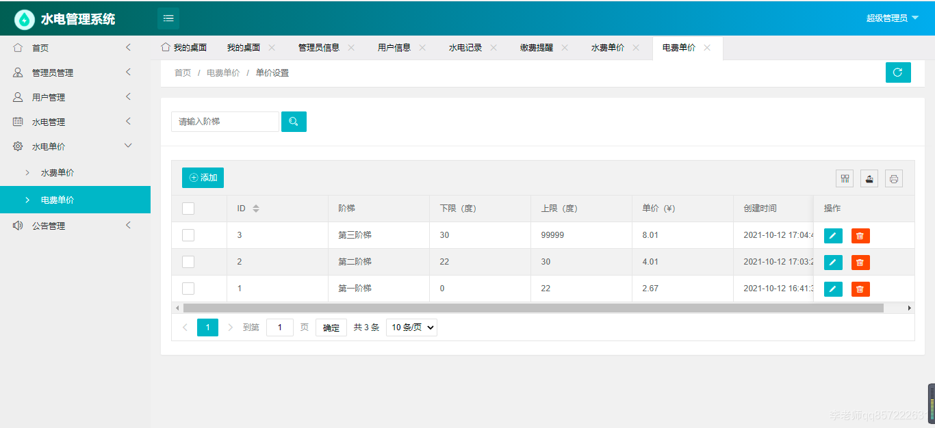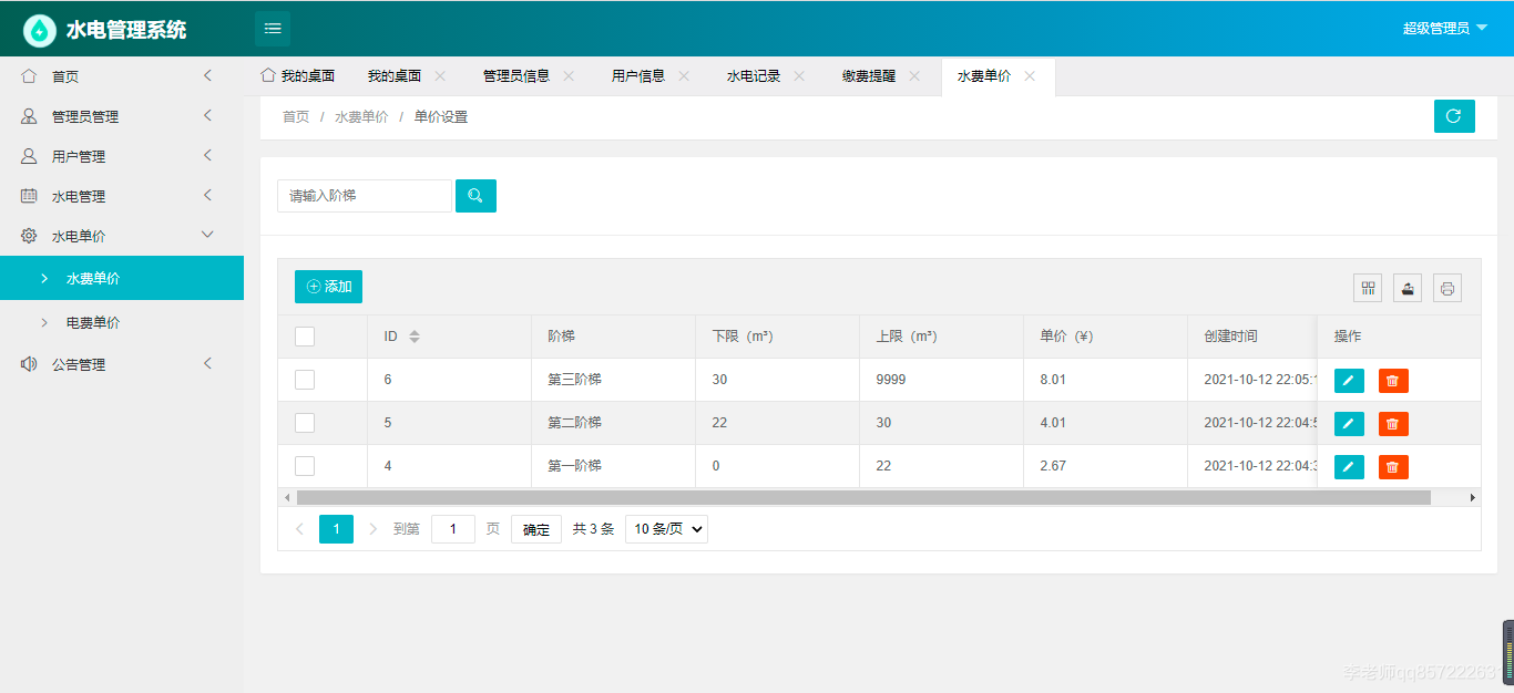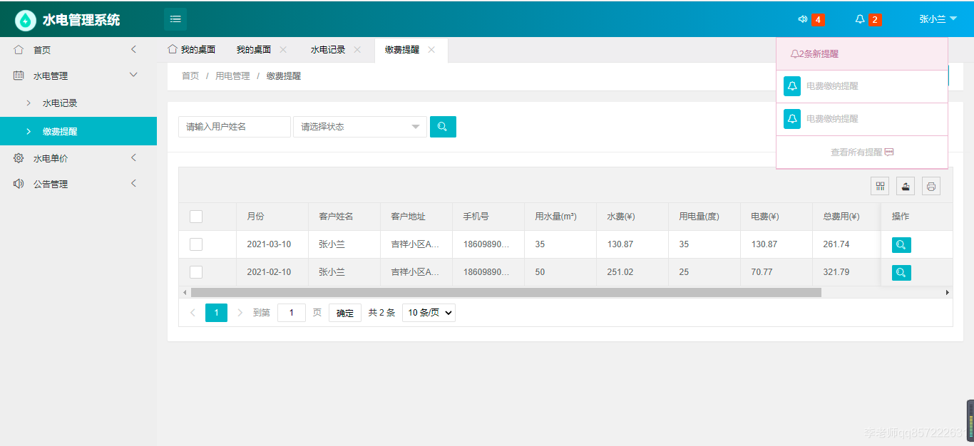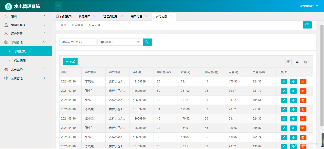 使用java+springboot+mysql开发的水电费管理系统,系统包含超级管理员,系统管理员、用户角色,功能如下: