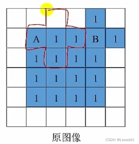 首先给出一个结构元素,结构元素可以任意指定,这里以十字型结构为例,图像的腐蚀常用于对二值化的图像进行处理, 将此结构元素放置在原图像中像素值为1的区域,我们将结构元素的中心像素放在A区域,得到如下形式: