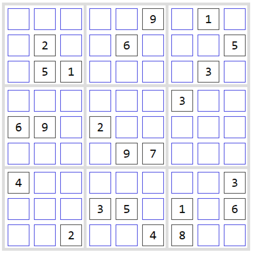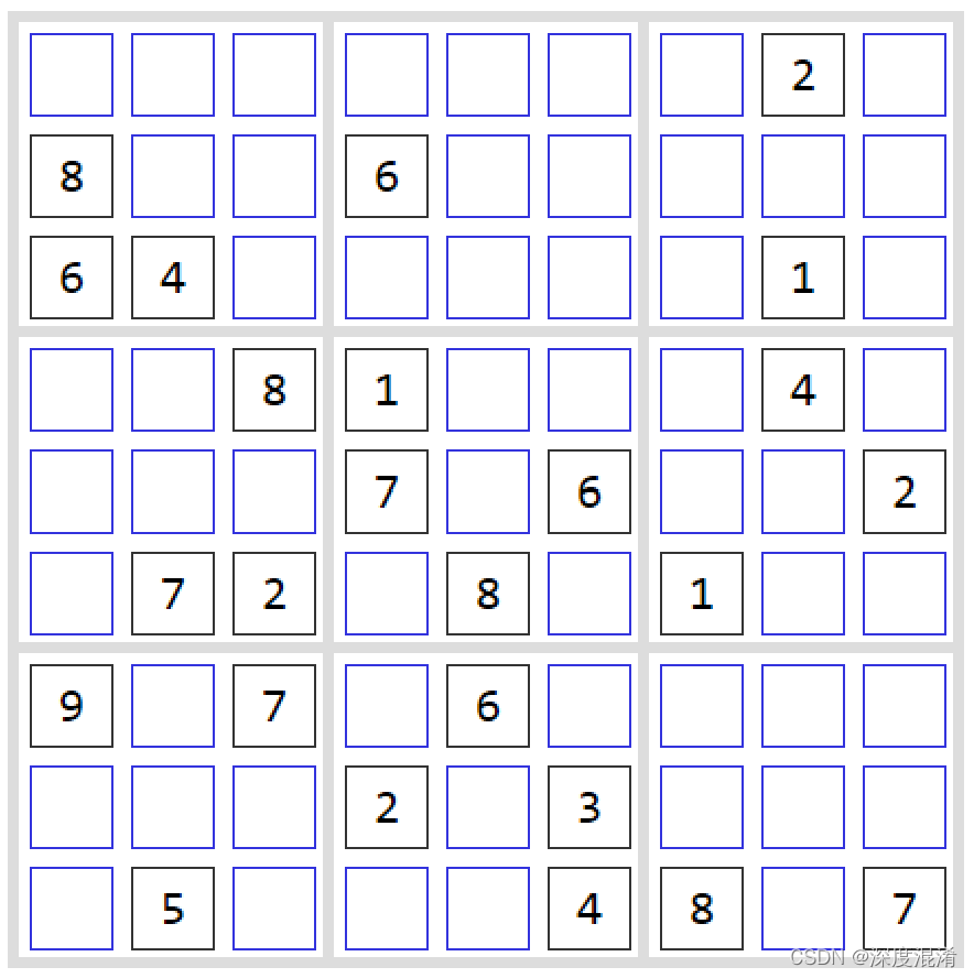 (2)9x9格子可划分为9个3x3的不重复的块(宫),每个3x3的块(宫)的9个格子由1--9数字填入,不得重复;