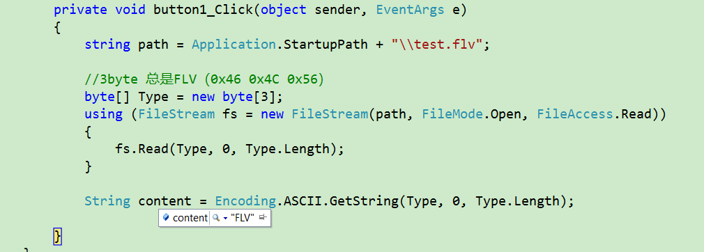 {string path = Application.StartupPath + "\\test.flv";//3byte 总是FLV(0x46 0x4C 0x56)byte[] Type = new byte[3];using (FileStream fs = new FileStream(path, FileMode.Open, FileAccess.Read)){fs.Read(Type, 0, Type.Length);}String content = Encoding.ASCII.GetString(Type, 0, Type.Length);}