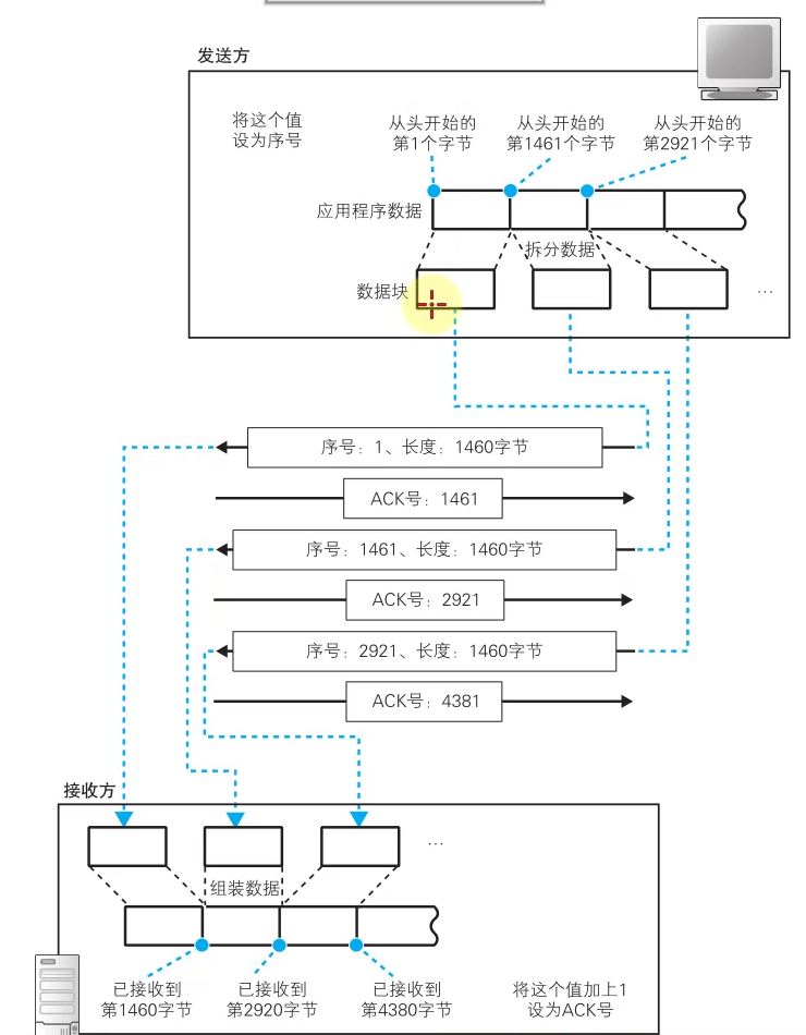 序号 seq:TCP 连接中传送的数据流中的每一个字节都按顺序编号(字节数)。序号字段的值则指的是本报文段所发送的数据的第一个字节的序号。